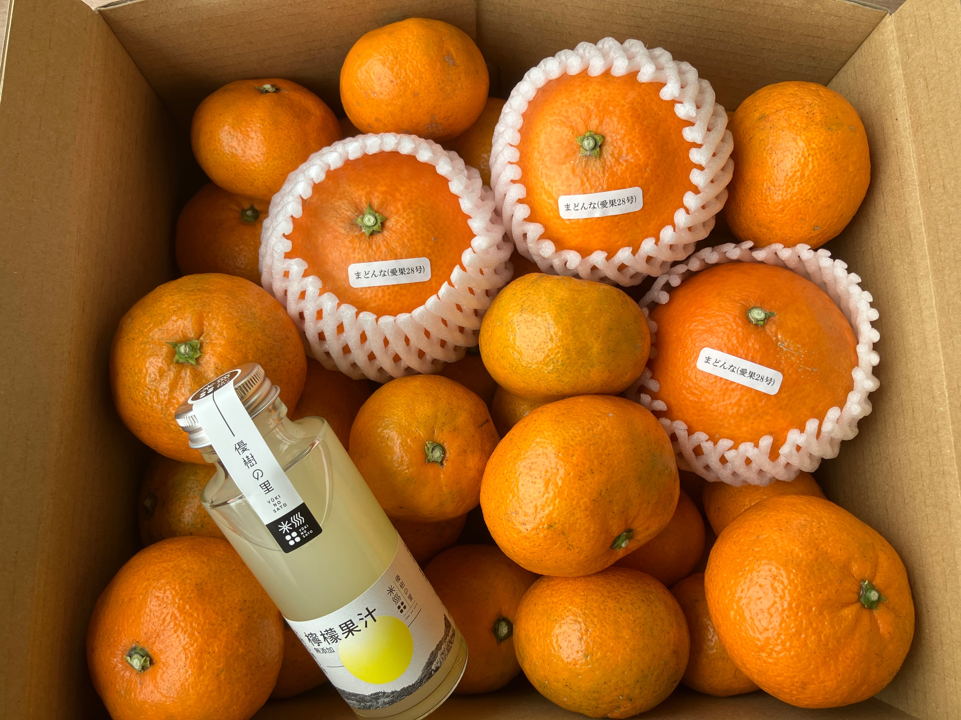 温州みかん、オーガニックまどんな(愛果28号)、オーガニックレモン100%ストレート果汁の詰め合わせです。